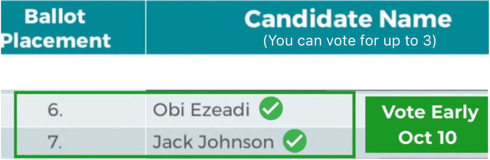 Vote early for Jack and myself when your ballots arrive the weekend of October 10. We will be placed #6 and #7 on your ballot.