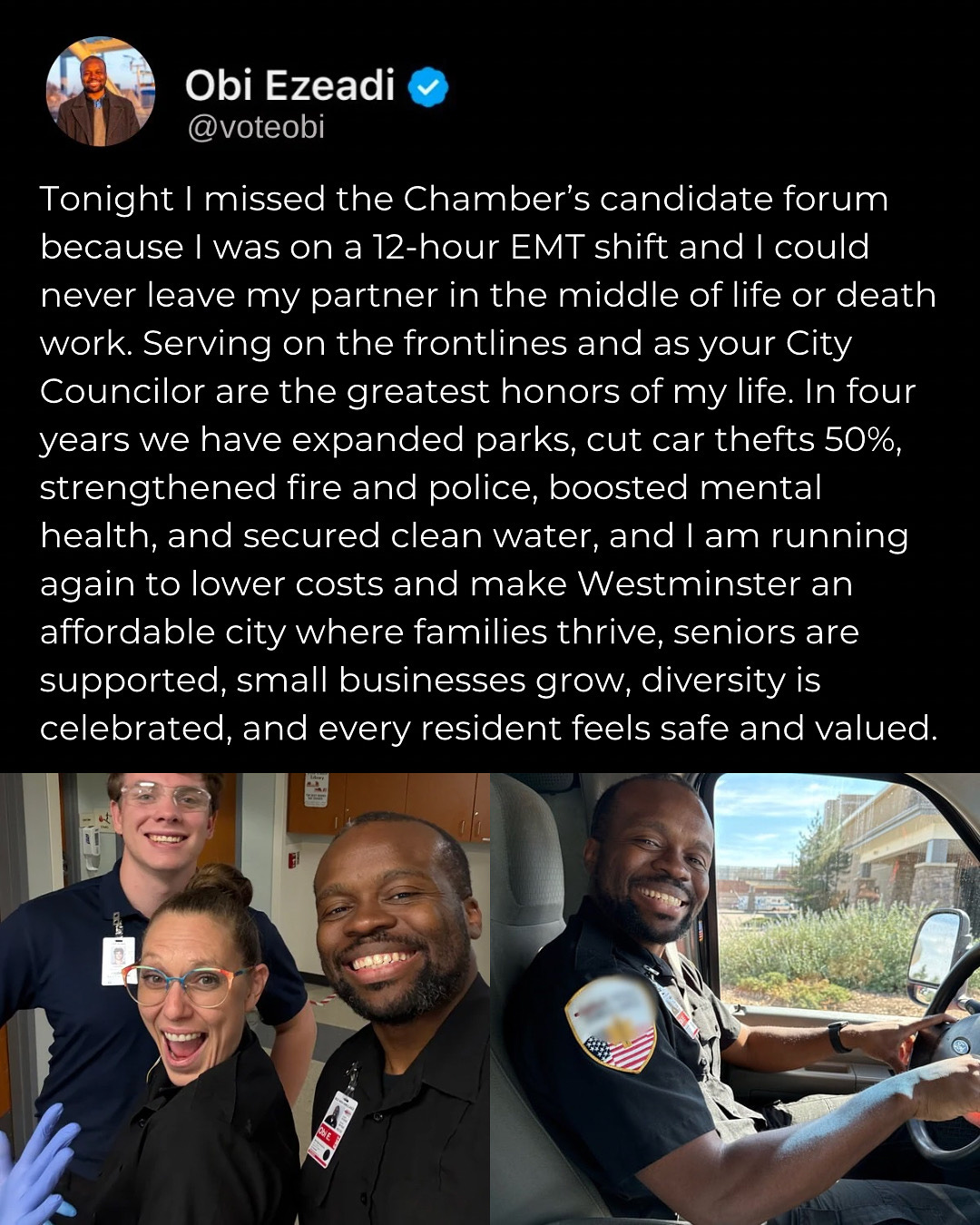 Obi Ezeadi is a first-generation American, first responder (EMT) and City Councilor who champions economic, democratic, and personal freedoms for all of Westminster. In just four years, Obi delivered more parks and housing, lower water costs, stronger mental health services, safer streets, historic labor agreements, free senior transit, major progress on homelessness, and new standards of transparency and accountability.