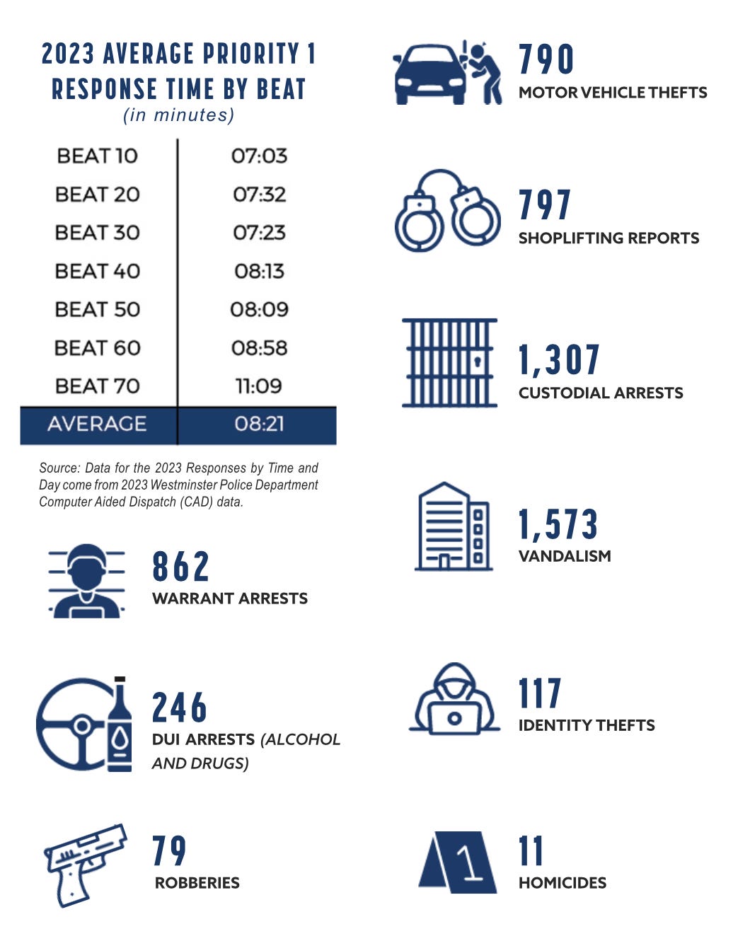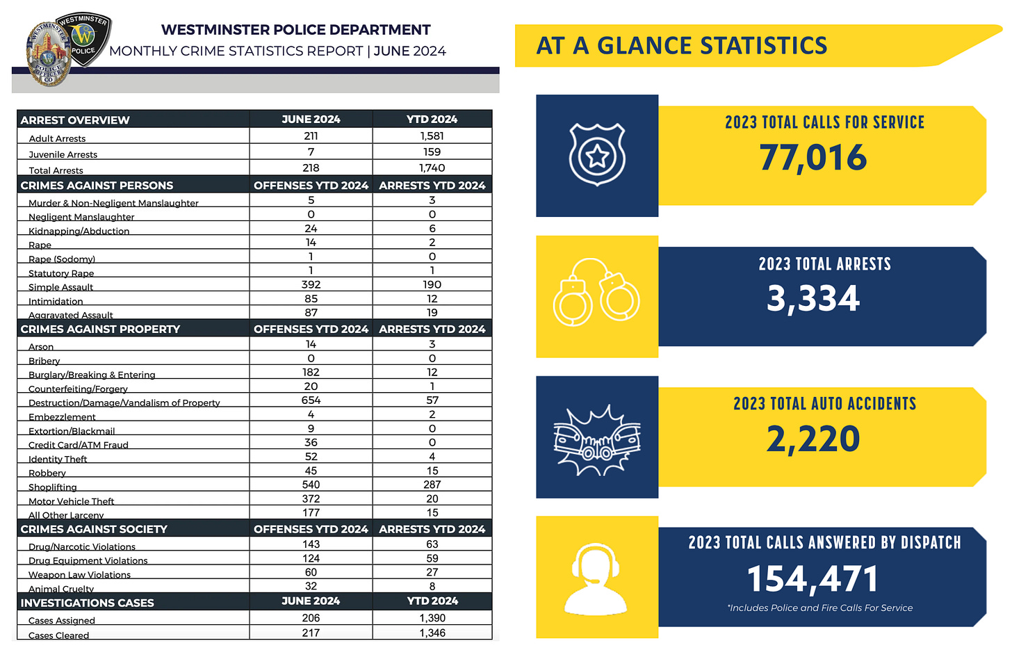 The Westminster Police Department is a full-service municipal law enforcement agency and the department is divided into seven geographical patrol beats that span the city.