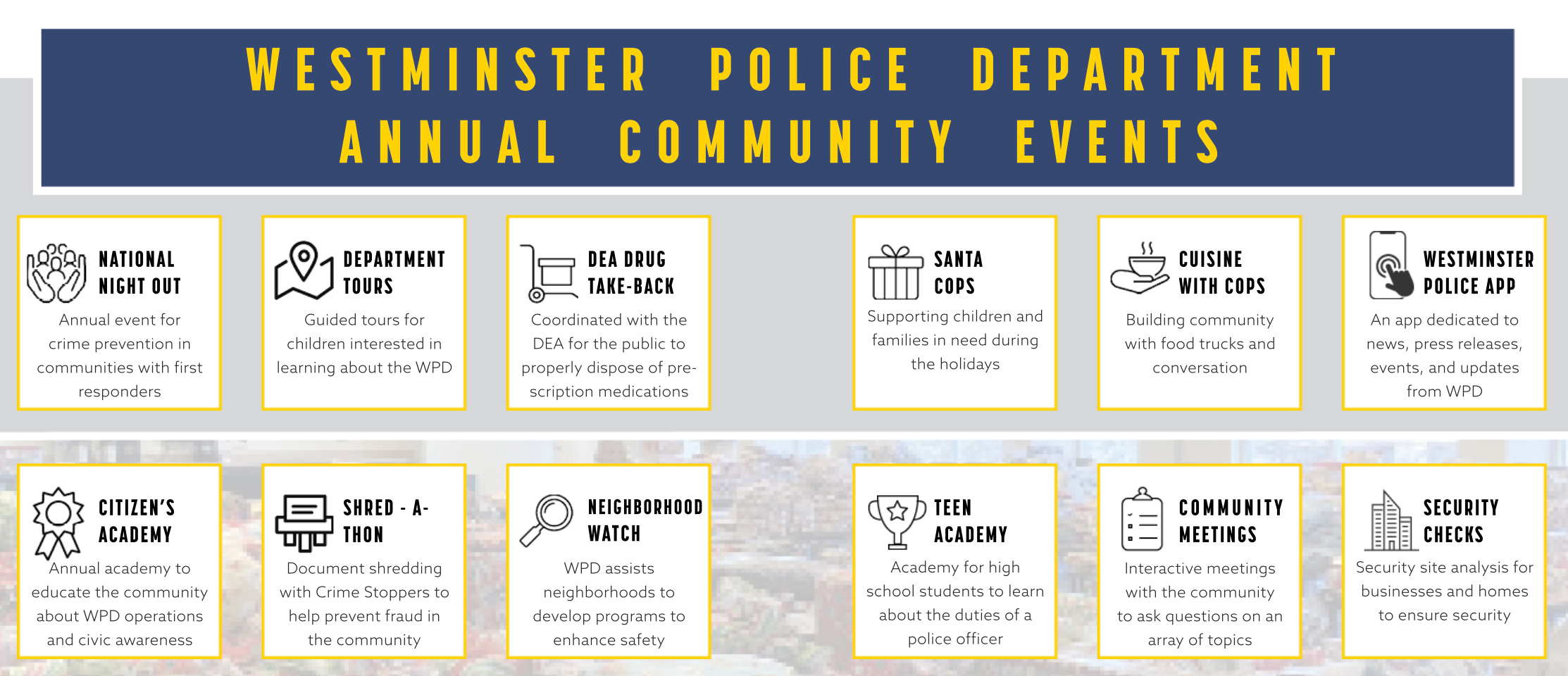 The Westminster Police Department strengthens community ties through events like Santa Cops, where officers and partners provide Christmas gifts to children from families facing severe hardships. Other events include: National Night Out, Department Tours, DEA Drug Take-Back, Santa Cops, Cuisine with Cops, Westminster Police App, Citizen’s Academy, Shred-A-Thon, Neighborhood Watch, Teen Academy, Community Meetings, Security Checks.