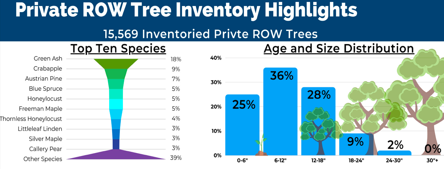 A 2023 inventory found that 10 species make up more than half of all public and private right-of-way trees, leaving our forest vulnerable if pests target a dominant type. Current threats include the emerald ash borer, ips beetle, elm leaf beetle, and thyronectria canker.