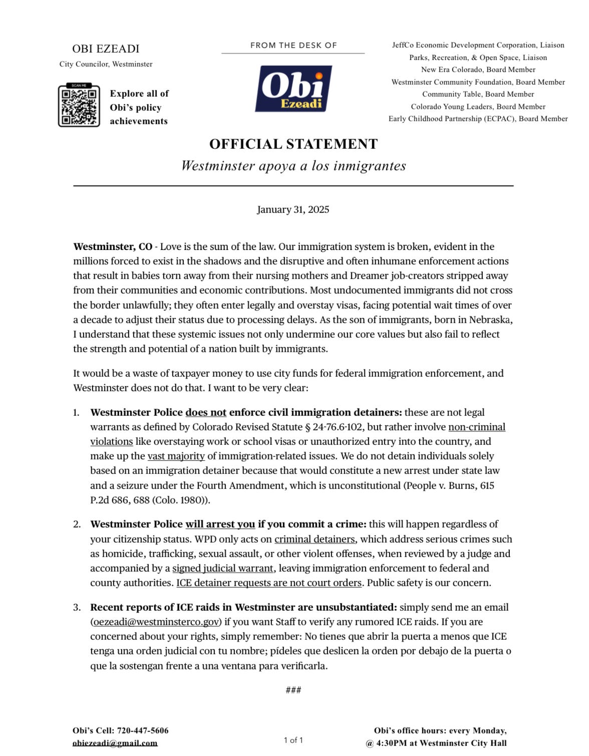 Recent reports of ICE raids in Westminster are unsubstantiated: simply send me an email (oezeadi@westminsterco.gov) if you want Staff to verify any rumored ICE raids. If you are concerned about your rights, simply remember: No tienes que abrir la puerta a menos que ICE tenga una orden judicial con tu nombre; pídeles que deslicen la orden por debajo de la puerta o que la sostengan frente a una ventana para verificarla.