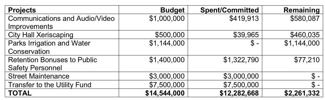 Update on American Rescue Plan Act (ARPA) funds as of Q3 2023: Bill was signed into law March 2021, providing $14.5M directly to Westminster. In October 2021, Westminster used the full $14.5M as backfill for lost revenue due to COVID-19. Reply to this email if you have any questions on these projects: