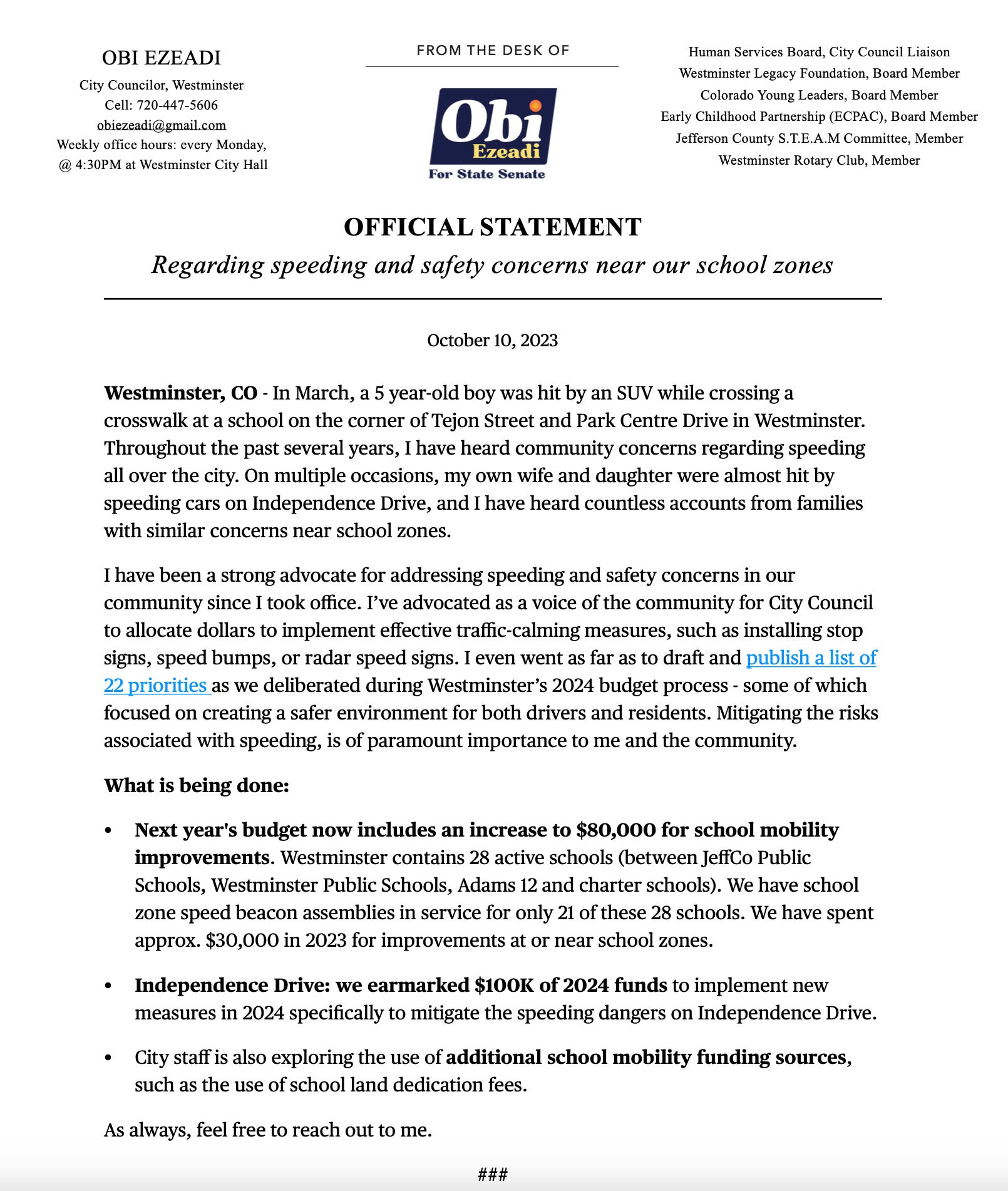 Click here to read my statement regarding speeding and safety concerns near Westminster school zones.