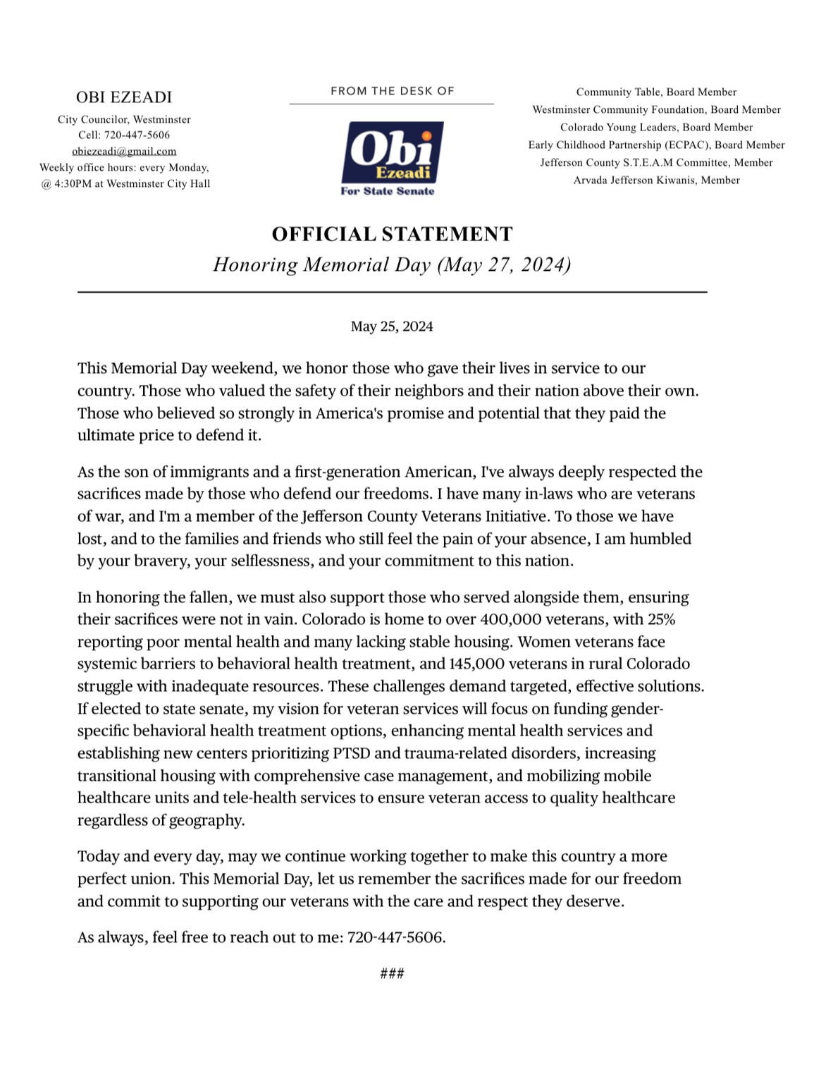 As the son of immigrants and a first-generation American, I've always deeply respected the sacrifices made by those who defend our freedoms. I have many in-laws who are veterans of war, and I'm a member of the Jefferson County Veterans Initiative. To those we have lost, and to the families and friends who still feel the pain of your absence, I am humbled by your bravery, your selflessness, and your commitment to this nation.