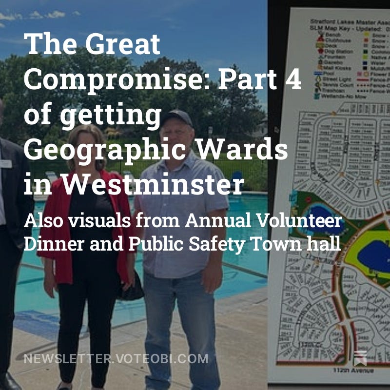 Vote YES on Westminster Ballot Issue 3D, because all residents deserve better representation and our current at-large system is exclusionary which impacts our seniors, fixed and low-income, and Black and Brown people the most. More info here, and see my prior newsletters about Wards. If it passes, it creates 3 geographic wards, each electing two City Councillors with staggered four-year terms, starting in 2025, and includes compact ward design, a 10% population deviation, a one-year residency requirement, and updates to ward boundaries every 10 years based on the Census, while adhering to term limits and laws to prevent gerrymandering.