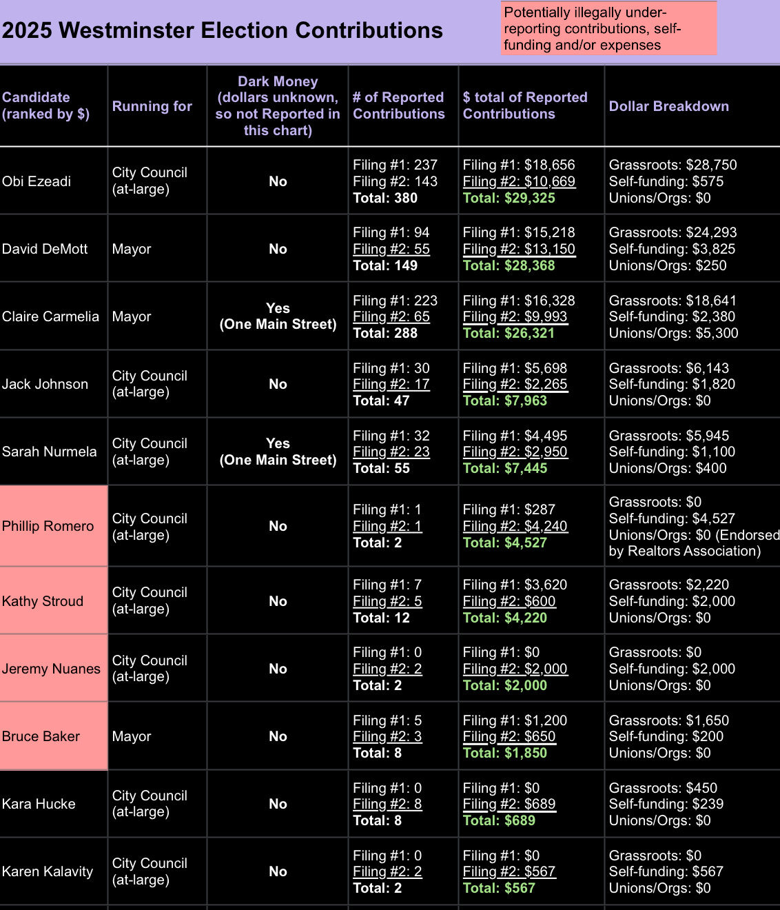 Dark money: The dark money column simply shows candidates endorsed by any dark money orgs, of which the only one filed in this Westminster election so far is One Main Street as an IEC for $12,000 (see their Independent Expenditure Committee filing here). The definition of dark money is based on lack of donor disclosure, not on intent or values. I and many others have personally benefited somewhat from soft-side spending in past races, and I agree that supportive outside spending is not necessarily bad since many good organizations operate IECs that legally spend on races without coordinating with candidates. Many bad orgs also have IECs and many of the bad ones are funded by MAGA, big corporations and anti-public school entities. But when an org chooses not to disclose their funding that is when it becomes “dark”.