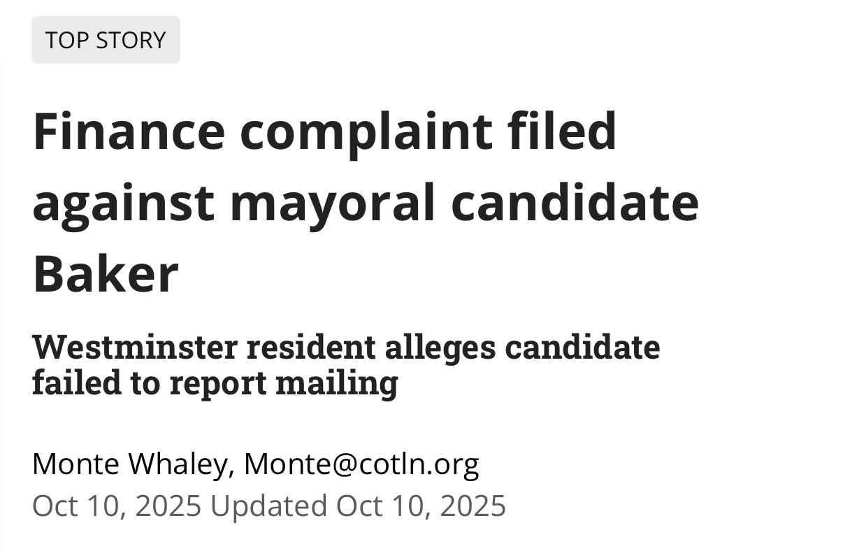 “Westminster’s City Clerk is investigating a resident’s complaint that mayoral candidate Bruce Baker violated campaign law by paying for campaign flyers and failing to report them as a political contribution/expenditure.
